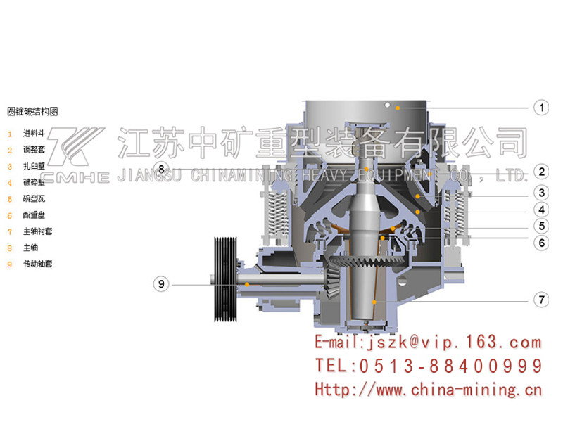 圓錐破碎機(jī)工作時,電動機(jī)的旋轉(zhuǎn)通過皮帶輪或聯(lián)軸器、圓錐破碎機(jī)傳動軸和圓錐破碎機(jī)圓錐部在偏心套的迫動下繞一周固定點作旋擺運(yùn)動。從而使破碎圓錐的破碎壁時而靠近又時而離開固裝在調(diào)整套上的軋臼壁表面,使礦石在破碎腔內(nèi)不斷受到?jīng)_擊,擠壓和彎曲作用而實現(xiàn)礦石的破碎。電動機(jī)通過傘齒輪驅(qū)動偏心套轉(zhuǎn)動,使破碎錐作旋擺運(yùn)動。破碎錐時而靠近又時而離開固定錐,完成破碎和排料。支撐套與架體連接處靠彈簧壓緊,當(dāng)破碎機(jī)內(nèi)落入金屬塊等不可破碎物體時,彈簧即產(chǎn)生壓縮變形,排出異物,實現(xiàn)保險,防止機(jī)器損壞。圓錐式破碎機(jī)在不可破異物通過破碎腔或因某種原因機(jī)器超載時,圓錐式破碎機(jī)彈簧保險系統(tǒng)實現(xiàn)保險,圓錐式破碎機(jī)排礦口增大。異物從圓錐破碎機(jī)破碎腔排出,如異物卡在排礦石可使用清腔系統(tǒng),使排礦繼續(xù)增大,使異物排出圓錐破碎機(jī)破碎腔。圓錐破碎機(jī)在彈簧的作用下,排礦口自動復(fù)位,圓錐式破碎機(jī)機(jī)器恢復(fù)正常工作。破碎腔表面鋪有耐磨高錳鋼襯板。排礦口大小采用液壓或手動進(jìn)行調(diào)整。