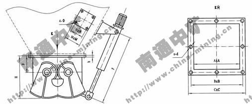 鄂式閘門由本體、扇形閘板、軸、齒輪、密封副,執(zhí)行機(jī)構(gòu)等部件構(gòu)成。手動或執(zhí)行機(jī)構(gòu)推動搖桿,使齒輪帶動扇形閘板沿軸心旋轉(zhuǎn),使兩個扇形閘板向兩邊開啟,物料隨即下落,待接料裝置滿載后,由執(zhí)行機(jī)構(gòu)帶動搖桿,使扇形閘板復(fù)位,關(guān)閉截斷下落的物料。