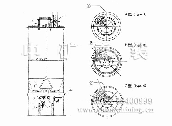 水泥儲(chǔ)存庫(kù)是在庫(kù)底中心位置設(shè)一錐形混合室,以降低庫(kù)內(nèi)的卸料壓力,消除漏斗流。混合室 設(shè)8~12個(gè)進(jìn)料孔,在混合室和庫(kù)壁之間的環(huán)形區(qū)設(shè)有8~12個(gè)充氣區(qū),卸料時(shí)輪流向相對(duì)的環(huán)形小 區(qū)充氣,使部分水泥流向中心混合室。在自上而下的流動(dòng)過(guò)程中,切割水平料層而產(chǎn)生重力混合作 用,進(jìn)入混合室后又因混合室內(nèi)的連續(xù)充氣攪拌而進(jìn)一步均化。這種庫(kù)的均化值可達(dá)5~9。電耗 0.15~0. 30kwh / t.