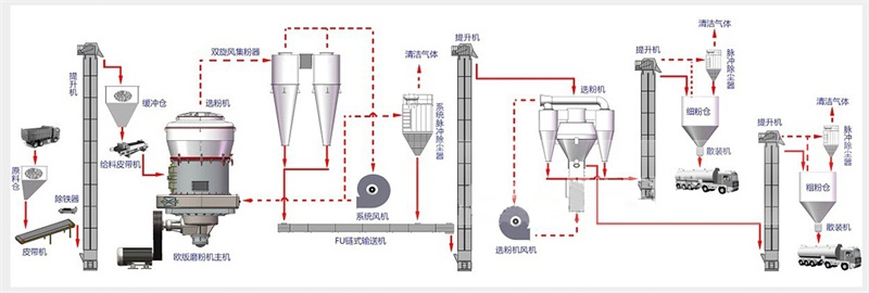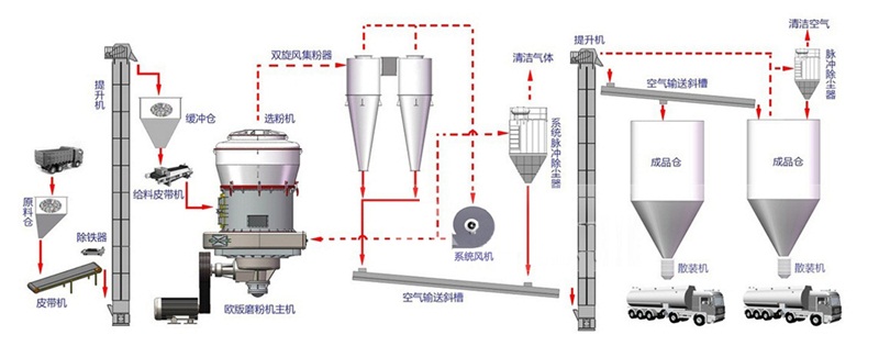 原料從儲(chǔ)倉(cāng)落入到計(jì)量皮帶機(jī)上,通過自卸式除鐵器除鐵后進(jìn)入歐版磨進(jìn)行粉磨,粉磨后的物料經(jīng)過風(fēng)力作用通過選粉機(jī)進(jìn)行分選,選出符合要求的成品粉,通過旋風(fēng)收集器進(jìn)行收集暫存。