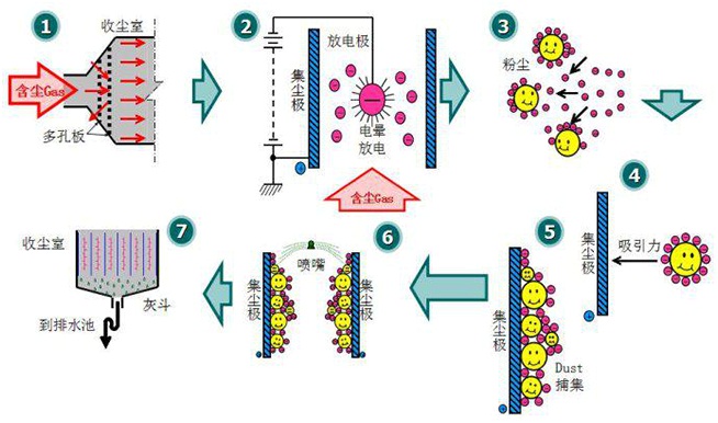 金屬放電線在直流高電壓的作用下①,將其周圍氣體電離②,使粉塵或霧滴粒子表面荷電③,荷電粒子在電場(chǎng)力的作用下向收塵極運(yùn)動(dòng)④,并沉積在收塵極上⑤,水流從集塵板頂端流下,在集塵板上形成一層均勻穩(wěn)定的水膜⑥,將板上的顆粒帶走⑦。因此,濕式電除塵器與干式ESP的除塵原理基本相同,都要經(jīng)歷荷電、收集和清灰三個(gè)階段,區(qū)別在于清灰方式的不同,濕式電除塵器采用液體沖刷集塵極表面來(lái)進(jìn)行清灰。其工作原理如圖1。